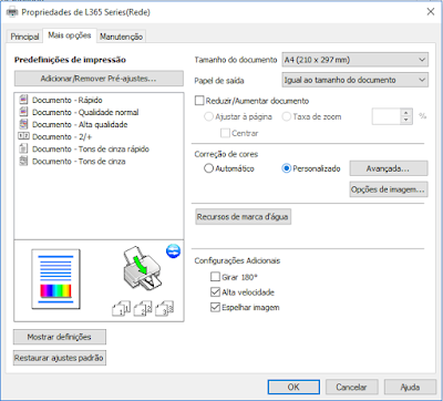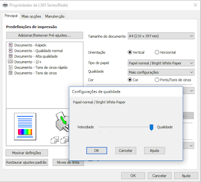 Passo 1: Ao dar saída ao impresso, em propriedades de impressão, selecione >Papel Tipo: papel Normal< e >Qualidade: máxima qualidade<. Ao selecionar >papel normal< a impressora vai executar uma mistura de tintas puras, sem misturar as cores para composisões, por exemplo, no caso do preto vai “jogar” somente tinta preta, sem misturar o Magenta e Ciano.