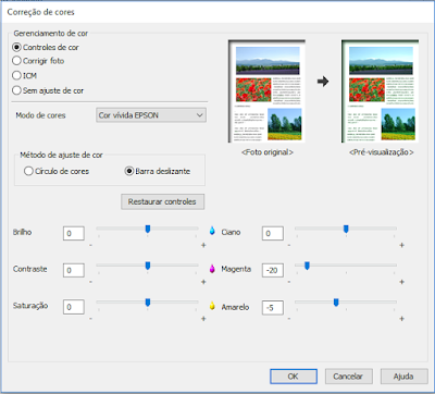 Passo 3: Selecione >Controles de Cor< e >Barra Deslizante<. Modo de cores >Cor vivida Epson<. Este ajuste faz toda a diferença,e pode ser considerado o “pulo do gato”. Ajuste o >Magenta -20<, este ajustes são livres e devem ser adaptados caso a caso. Obs.: Estes ajustes podem mudar de acordo com cada impressora.