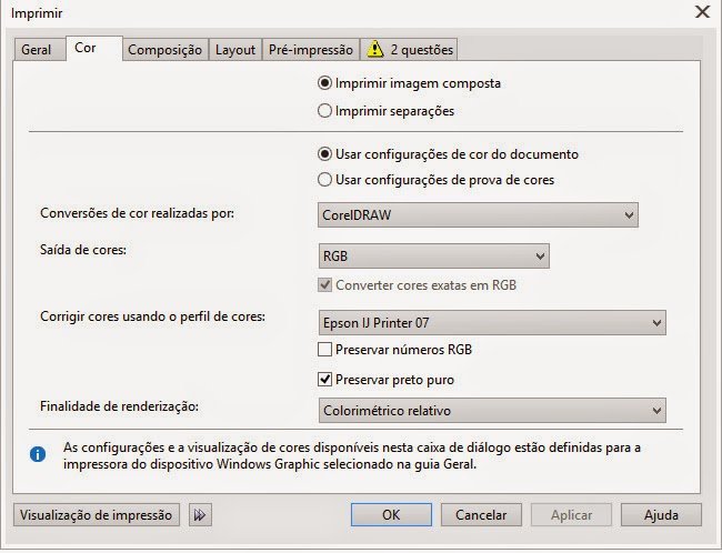 Passo 4: E finalmente mantenha >Colorimétrico relativo< e perfil >Epson IJ printer 07<. Abaixo as telas do CorelDraw e Photoshop.