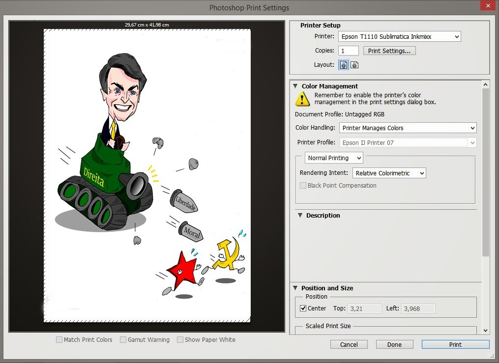 Em nosso caso específico, que trabalhamos com tintas sublimáticas, usar o perfil padrão das impressoras faz com que as cores fiquem longe da realidade, pelo fato delas virem calibradas de fábrica para tintas e papéis fotográficos.